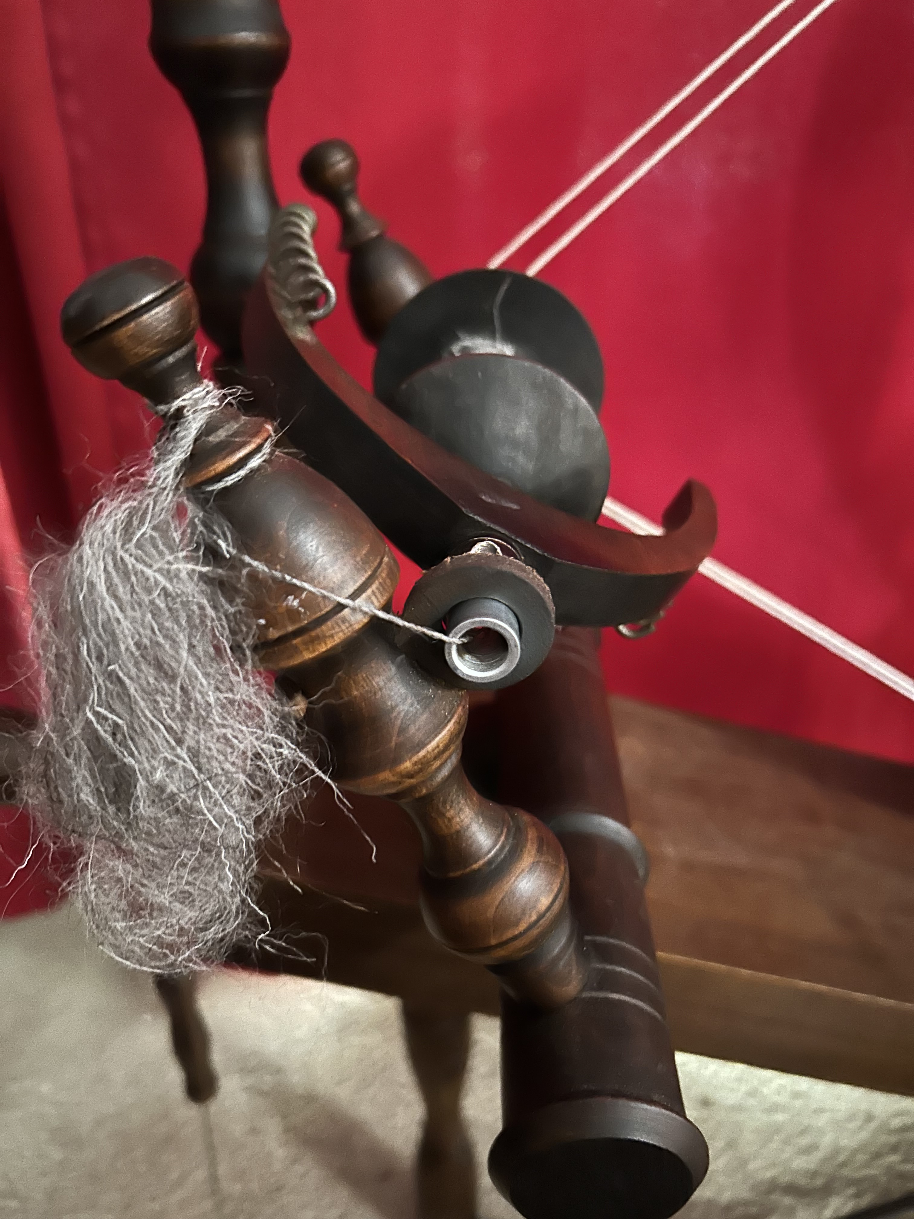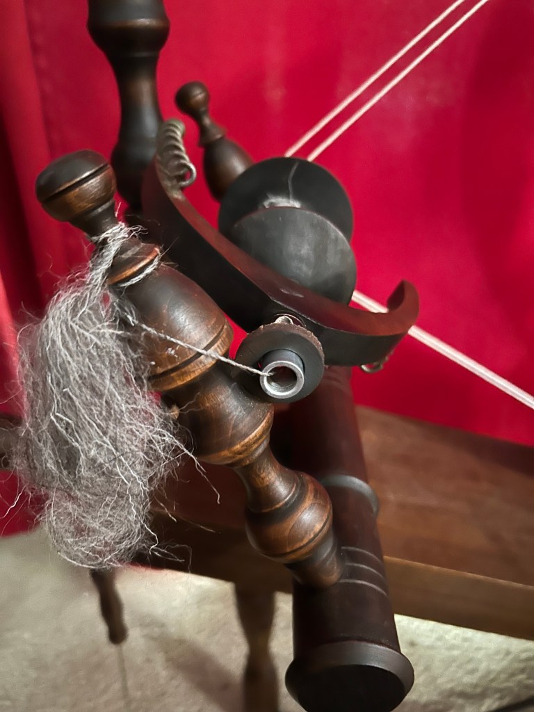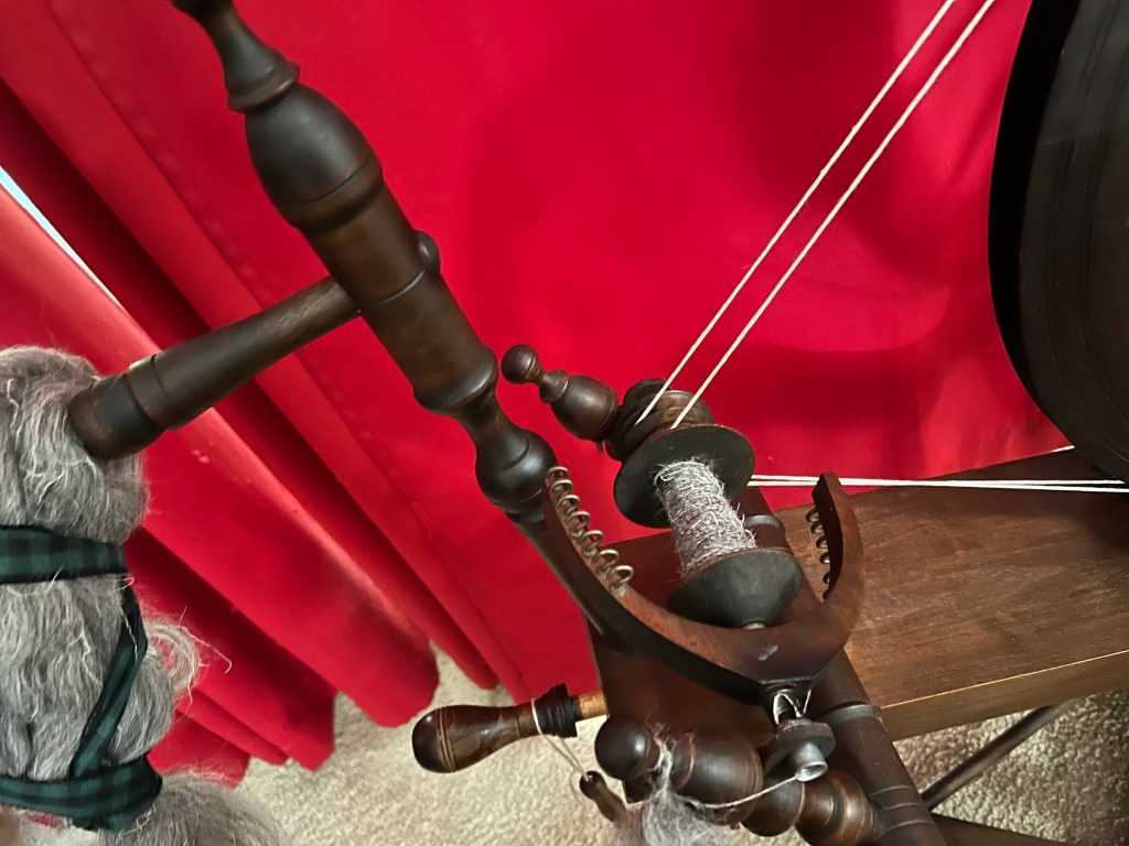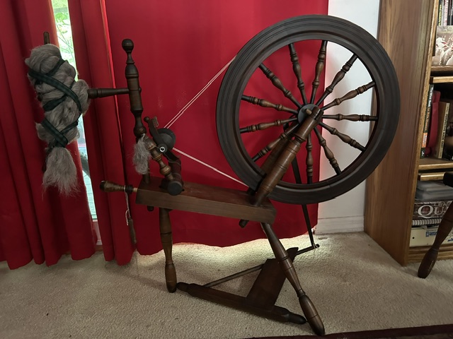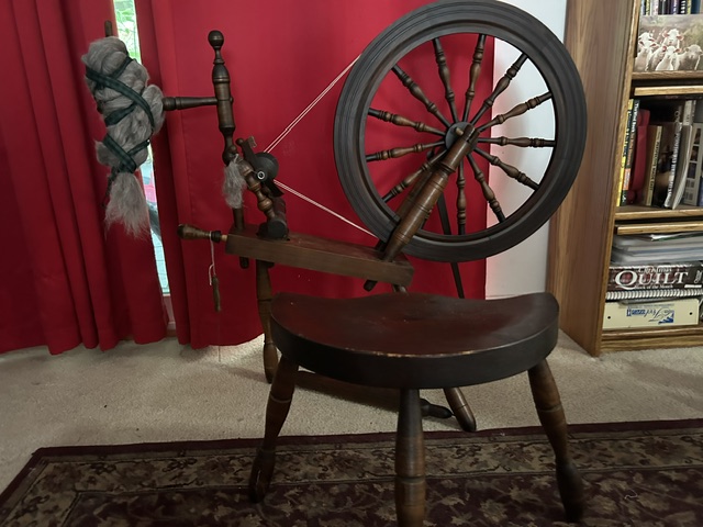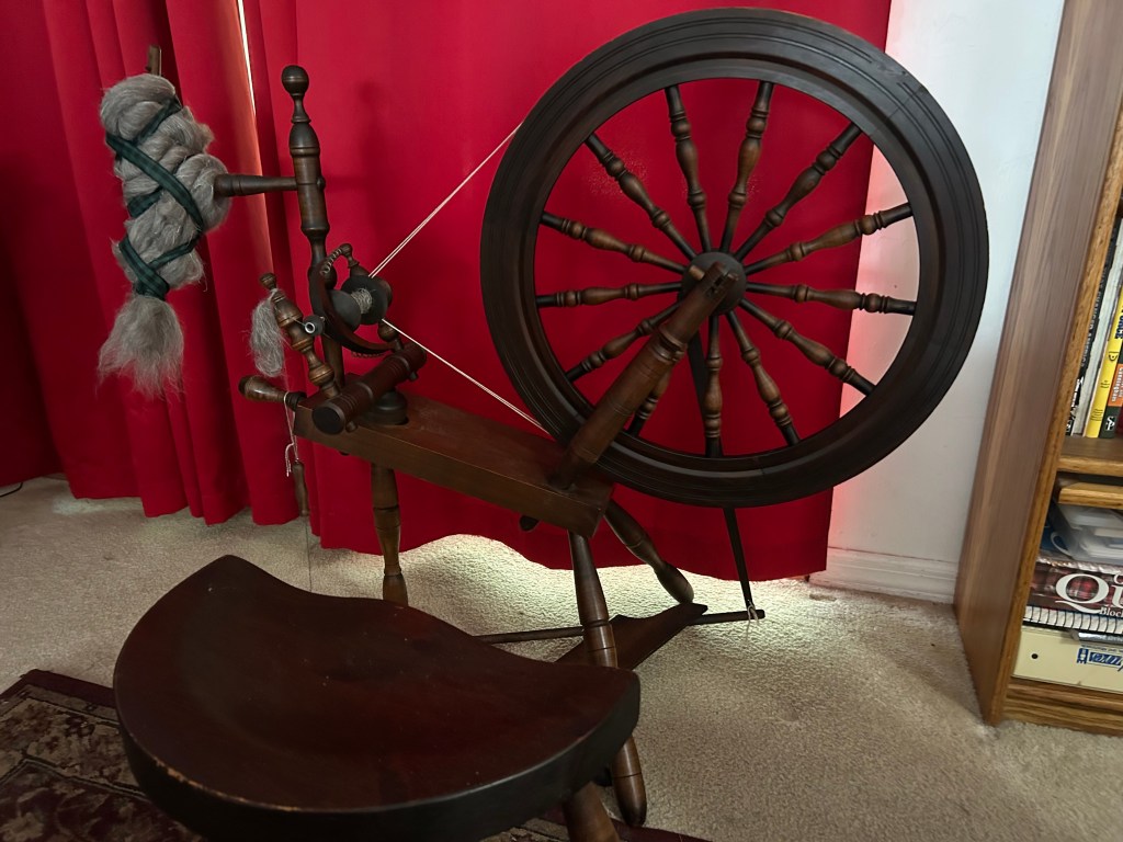 This wheel spins beautifully. The wheel has a slight wobble which does not have an effect on spinning yarn. Wheel comes with one bobbin, original distaff, and original spinning chair. Nice smooth spinning wheel. $200. Contact president.ghg@gmail.com for more.